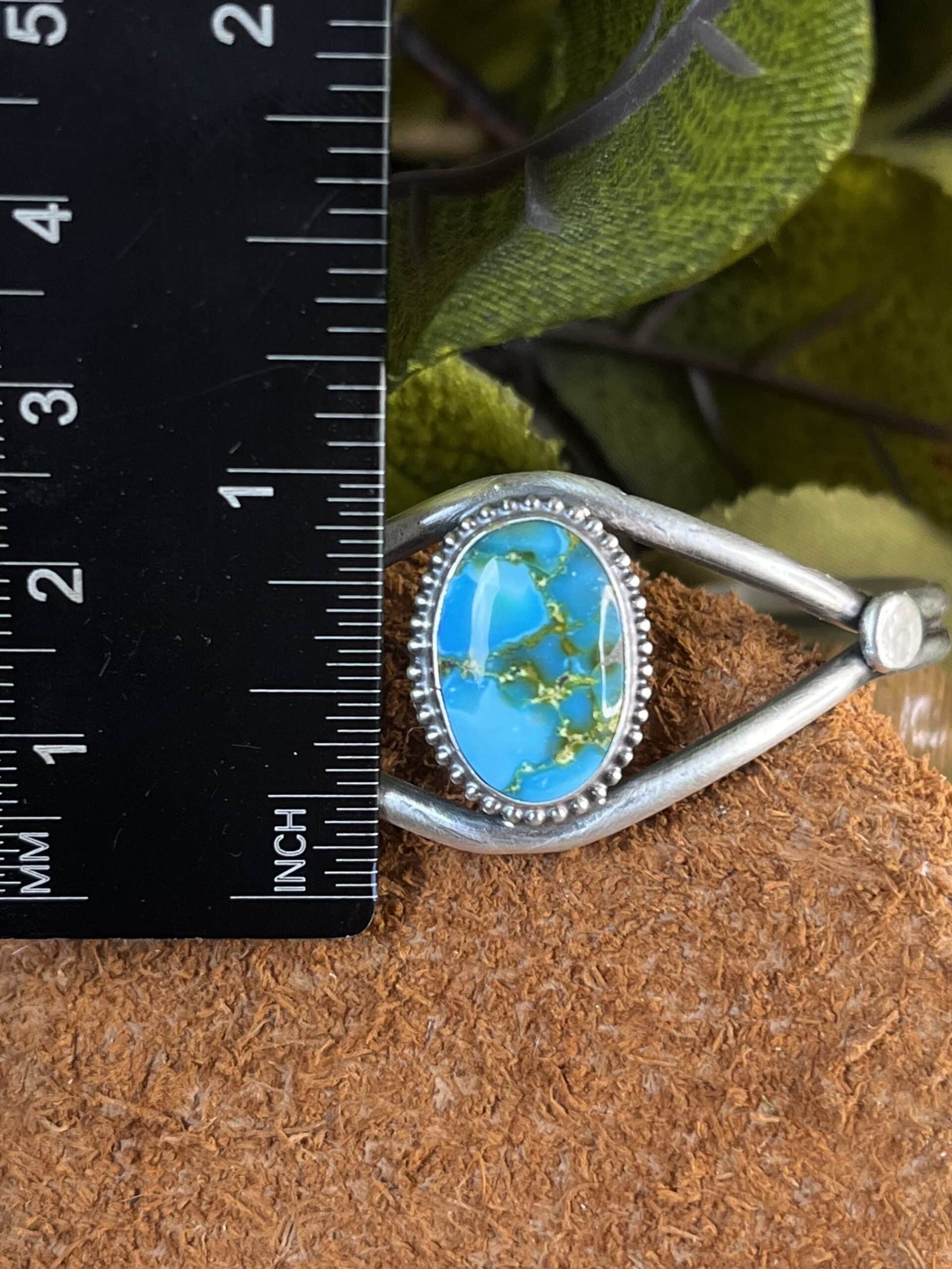 This Kingman bracelet is set to stun! Shades of bright, beautiful blue showcase glittering stretches of gold – veins of treasure. Bracelet measures 5 inches in length from end to end along the inside of the band as well as 7/8 inch in width, with a gap of 1 inch. Artist Stamp: J. Tso.