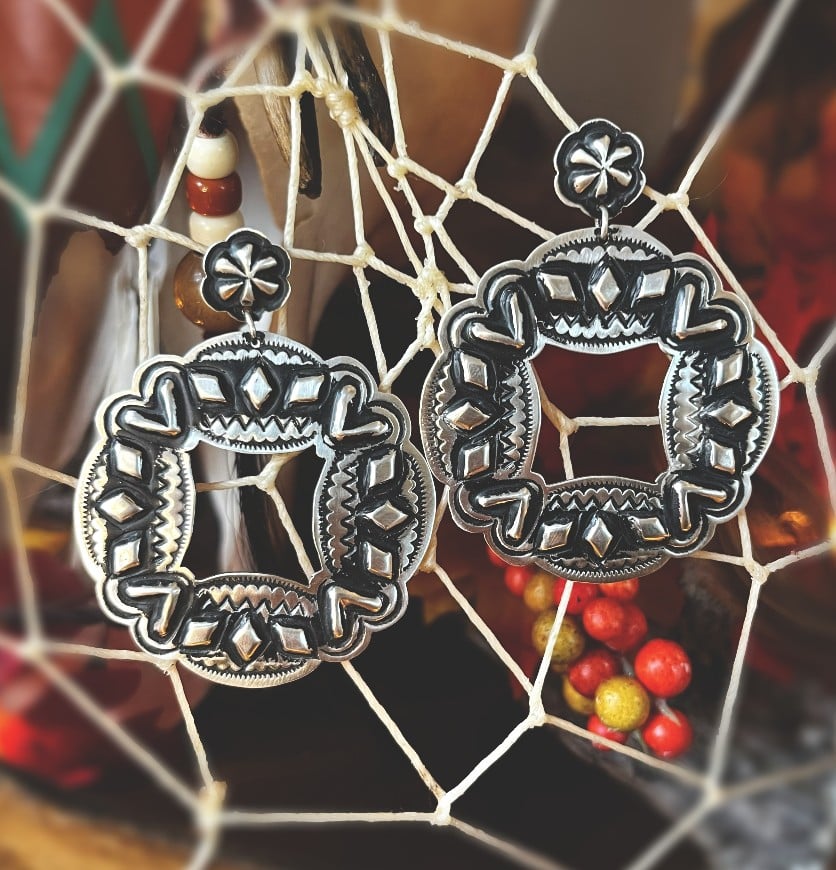 Dark, elegant pair of Sterling silver earrings! These pieces exude midnight class – shadow and light. Earrings measure 2 5/8 inches in length and 2 1/8 inch in width.
